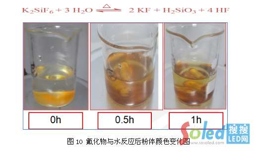 穩(wěn)定性:氟化物熒光粉自身結構不穩(wěn)定,有一定的吸濕性,這項特性與硅酸鹽相似,且氟化物熒光粉在溫度升高時易與水發(fā)生分解反應生成有毒的HF氣體,此反應是可逆的,遇水后粉體外觀顏色由橙色變成褐色(如下圖10所示),化學反應式為: