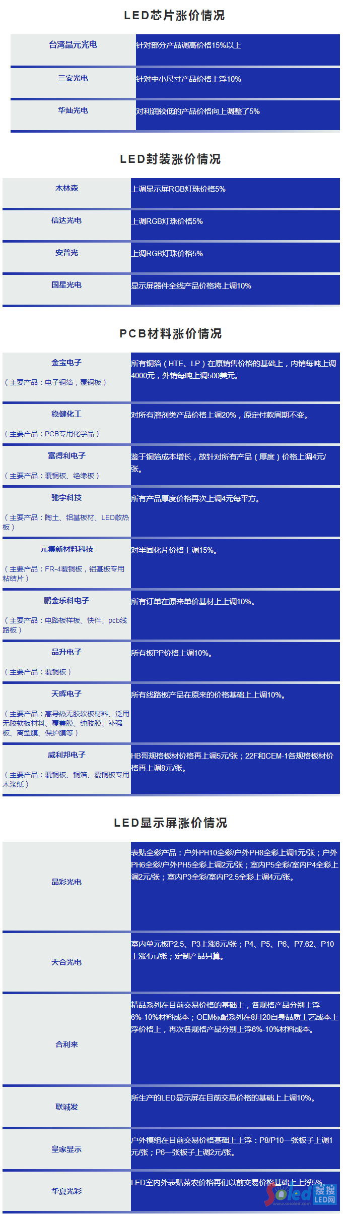 下面今年LED顯示屏產(chǎn)業(yè)各領(lǐng)域內(nèi)企業(yè)漲價情況表: