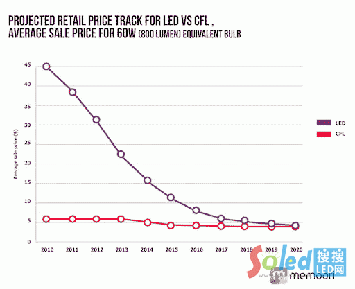 Memoori Research發(fā)現(xiàn),LED照明系統(tǒng)的成本下降率為每年18%。其中,可取代40W白熾燈的LED燈泡的全球平均售價(jià)已經(jīng)下跌為15美元,60W的LED產(chǎn)品為21美元。在2018年前,LED將會(huì)連續(xù)明顯下降。