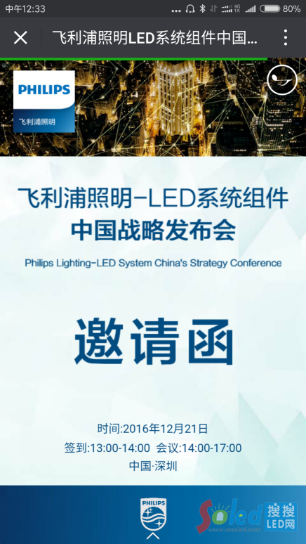 12月9日,飛利浦照明官方微信號正式發(fā)布了其將于12月21日在深圳舉辦的“LED系統(tǒng)組件中國戰(zhàn)略發(fā)布會”的邀請函。