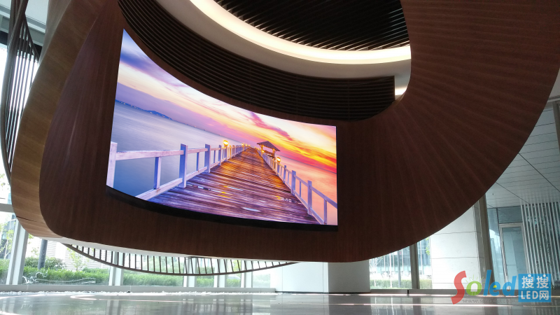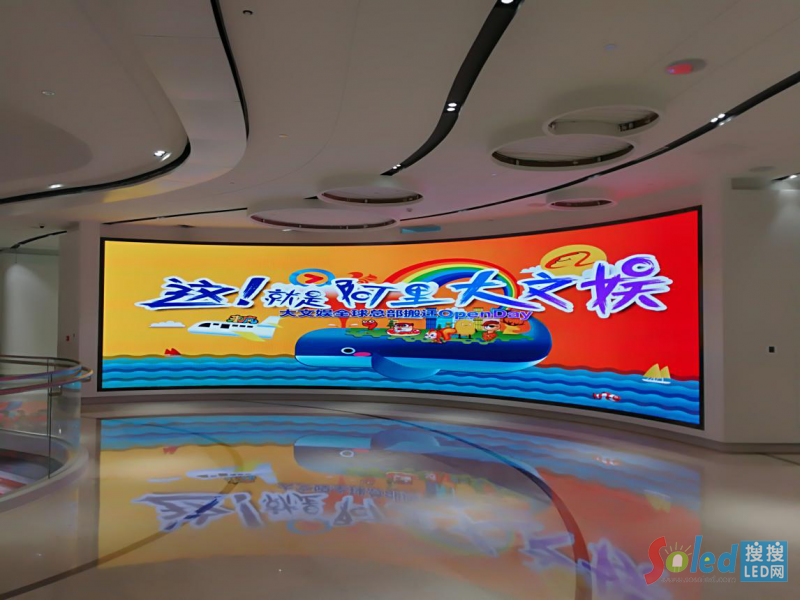 另一塊小間距LED創(chuàng)意顯示屏則安裝于阿里巴巴文娛集團二樓政府接待區(qū),大幅度的內弧造型,無縫隙化的完美拼接,不僅可以流暢穩(wěn)定的播放阿里巴巴各類視頻圖文畫面,兼?zhèn)淇萍挤逗蜕虅辗,更為到訪的政府官員帶來全新的感官體驗。