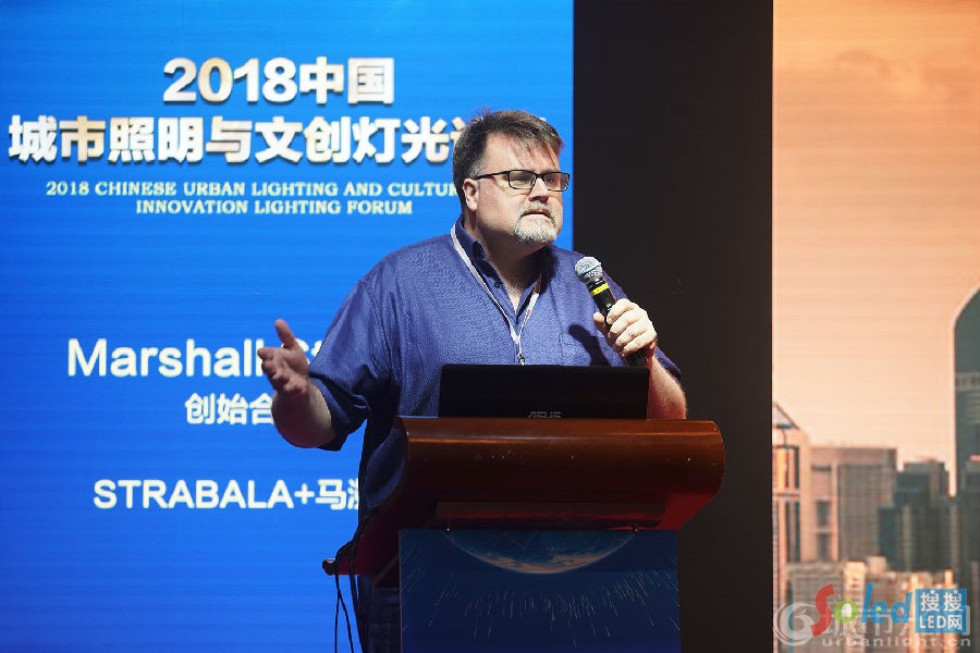 STRABLA+馬溯設(shè)計(jì)創(chuàng)始合伙人、首席設(shè)計(jì)師 Marshall Strabala先生,他是超高層建筑設(shè)計(jì)大師,迪拜哈法利塔和上海中心的總設(shè)計(jì)師,全世界十大最高建筑中他占有其三。他帶來(lái)了題為【上海中心大廈燈光設(shè)計(jì)案例分享】的精彩分析,細(xì)致地分析了大廈的燈光設(shè)計(jì)與建筑特色。上海中心大廈創(chuàng)造性地采用了雙層玻璃幕墻,是全球唯一的的雙層皮超高層。“這是非常小的一個(gè)idea,這是個(gè)形如茶杯雙層的設(shè)計(jì)邏輯關(guān)系,在邏輯上來(lái)說(shuō)它就是上海中心的外皮跟內(nèi)皮。這充分體現(xiàn)了我們公司的‘以少得多’的設(shè)計(jì)理念,以最小的代價(jià)得到更多需要實(shí)現(xiàn)的功能和效果。”