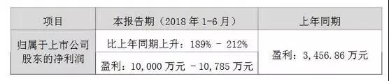 據(jù)公告顯示,2018年1月1日-2018年6月30日,公司實現(xiàn)歸屬于上市公司股東的凈利潤10,000萬元-10,785萬元,比上年同期3,456.86萬元上升189%-212%。