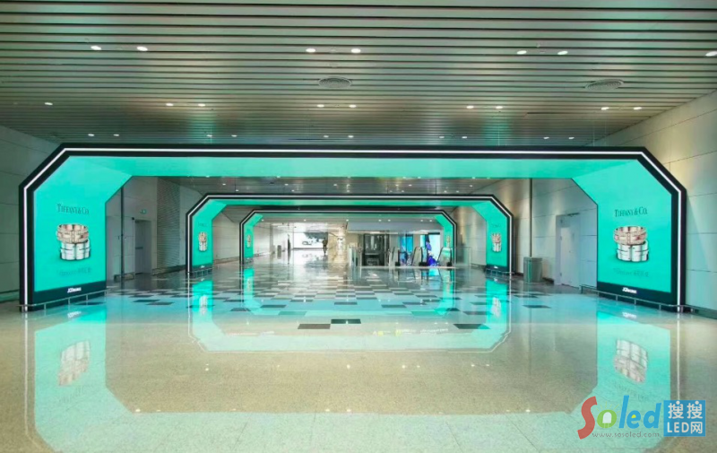 項目由5組LED顯示屏咬合構(gòu)成,可實現(xiàn)前后左右和底面共5面顯示。屏體采用環(huán)繞式無邊界設(shè)計,轉(zhuǎn)角部分無縫連接,畫面播放采用集散式控制。