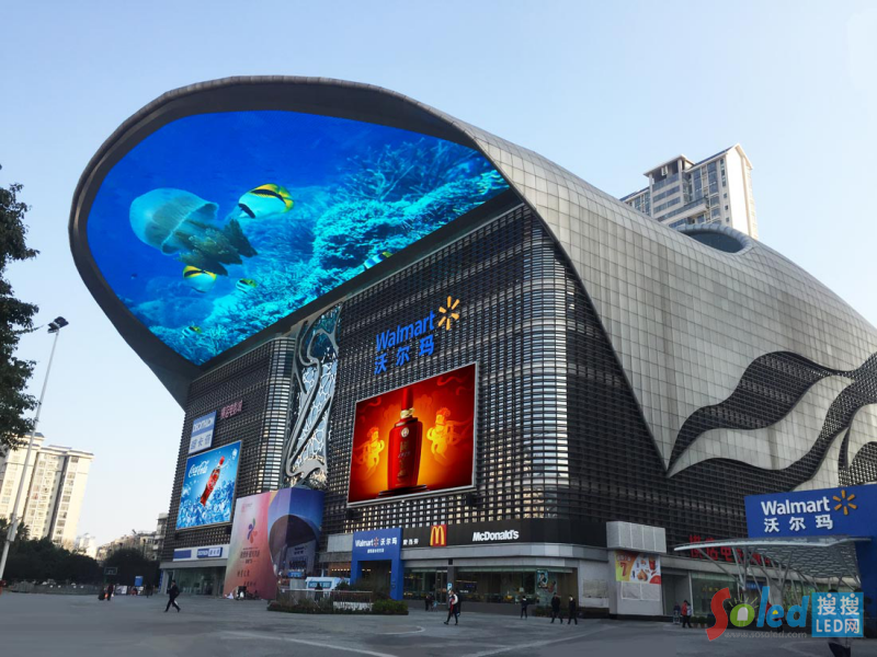 深圳市奧拓立翔光電科技有限公司以創(chuàng)意LED天幕聞名,承制的柳州金綠洲星光大道購物廣場LED天幕面積達(dá)到2607m2。項目造型宛如碩大的“帽檐”,采用了平面異形弧形拼接的解決方案,較常規(guī)箱體式顯示屏節(jié)能達(dá)60%,輕65%,其通透率高達(dá)60%。