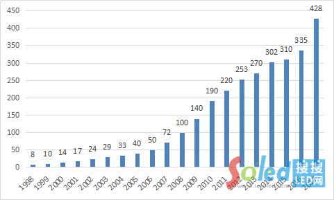 圖1所示是我國的LED顯示應(yīng)用市場從1998-2017年間的銷售增長變化情況。(單位:億元人民幣。)