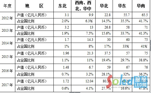 表2:近五年LED顯示應(yīng)用產(chǎn)業(yè)地區(qū)分布情況(不完全統(tǒng)計)