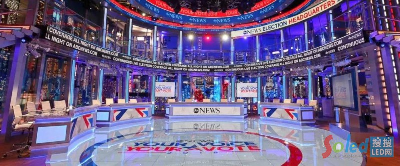 整個大廳簡潔明了,嘉賓分坐內(nèi)部兩側(cè)。地板、弧形墻壁、曲面天花板,全部為LED顯示屏包裹。配合AR技術(shù)變幻實(shí)時(shí)數(shù)據(jù)視頻圖像,可以讓用戶在觀看主持人發(fā)言的同時(shí),不會錯過大選結(jié)果的實(shí)時(shí)進(jìn)度。“創(chuàng)造性的,互動的故事講述有很大的潛力,可以幫助觀眾更好地理解復(fù)雜的信息,” ABC新聞的圖像運(yùn)營總監(jiān)Gargle解釋道。