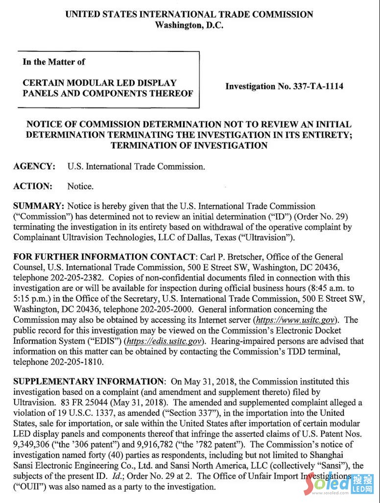 2019年2月21日,美國國際貿(mào)易委員會(ITC)發(fā)布公告稱,對涉華特定模塊化LED顯示面板及其組件(CERTAIN  MODULAR  LED DISPLAY  PANELS  AND  COMPONENTSTHEREOF,調(diào)查編碼:337-TA-1114)作出337調(diào)查部分終裁: