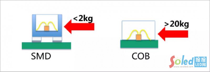 SMD LED小間距顯示技術(shù)用于100英寸以上電視機(jī),有兩個(gè)難以逾越的技術(shù)障礙,使得這種技術(shù)難以成為100英寸以上電視采用的技術(shù)。一個(gè)技術(shù)障礙是LED燈珠防撞能力差,像素可靠性低。用SMD 1010器件制作的LED小間距顯示屏,其推力比COB顯示屏的推力小了一個(gè)數(shù)量級(jí),導(dǎo)致其可靠性低,特別是在P1.0以下點(diǎn)間距的低可靠性,基本無法實(shí)現(xiàn)量產(chǎn)。