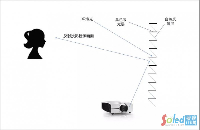 激光投影抗光幕示意圖如圖所示,抗光幕微結(jié)構(gòu)為鋸齒狀的光學(xué)結(jié)構(gòu),鋸齒結(jié)構(gòu)上方為涂覆黑色材料的吸光層,下方為涂覆特殊材料的白色反光層。黑色層可以吸收環(huán)境光,提高對(duì)比度,白色反光層用于投影時(shí)反射圖像。從抗光幕的微結(jié)構(gòu)可以發(fā)現(xiàn),幕布無法實(shí)現(xiàn)全部黑色,還有相當(dāng)一部分白色,導(dǎo)致幕布的對(duì)比度不高,無法實(shí)現(xiàn)高品質(zhì)的畫面顯示。