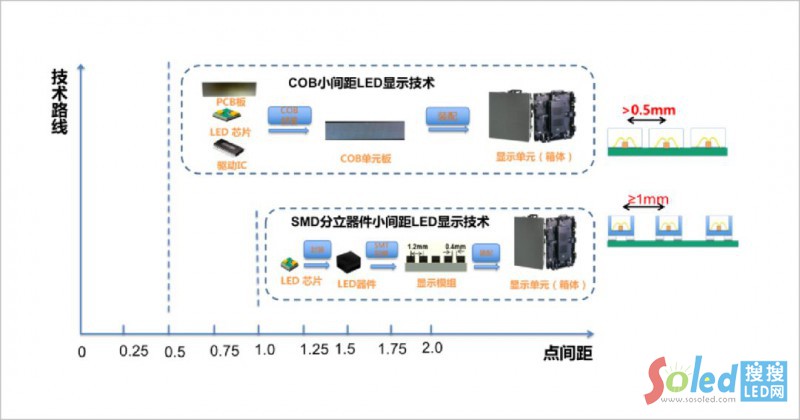 SMD小間距顯示與COB微間距顯示能實(shí)現(xiàn)的點(diǎn)間距范圍比較