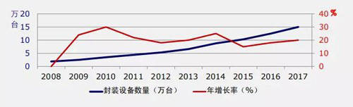 封裝市場的高速前進帶動封裝設備的需求量。數(shù)據(jù)顯示,從2008到2017年的十年間,設備市場在格局和規(guī)模方面都發(fā)生了顯著的變化。從發(fā)展規(guī)模來看,封裝設備隨行業(yè)同步呈現(xiàn)每年兩位數(shù)快速增長的態(tài)勢,但數(shù)率是下降的,近幾年相對處于平穩(wěn)期。