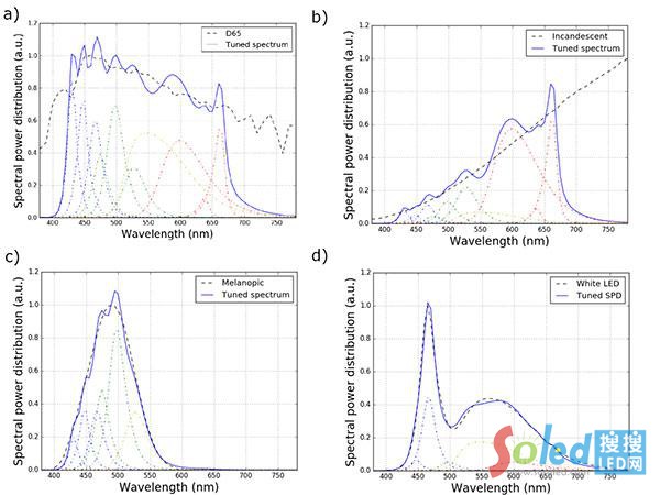 上圖通過優(yōu)化LED光引擎(點劃線)的10個不同通道權重制成。四個例子都對光譜進行了歸一化處理,并且以任意單位顯示。