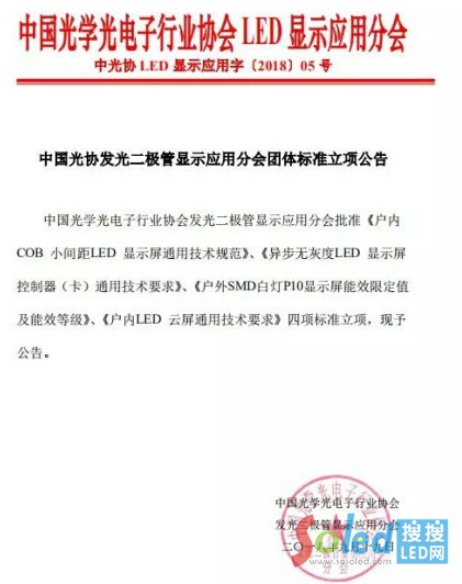 核心提示:近日,中國(guó)光學(xué)光電子行業(yè)協(xié)會(huì)LED顯示應(yīng)用分會(huì)發(fā)布了關(guān)于團(tuán)體標(biāo)準(zhǔn)立項(xiàng)的公告。標(biāo)準(zhǔn)立項(xiàng)公告包含了《戶(hù)內(nèi)COB小間距LED顯示屏通用技