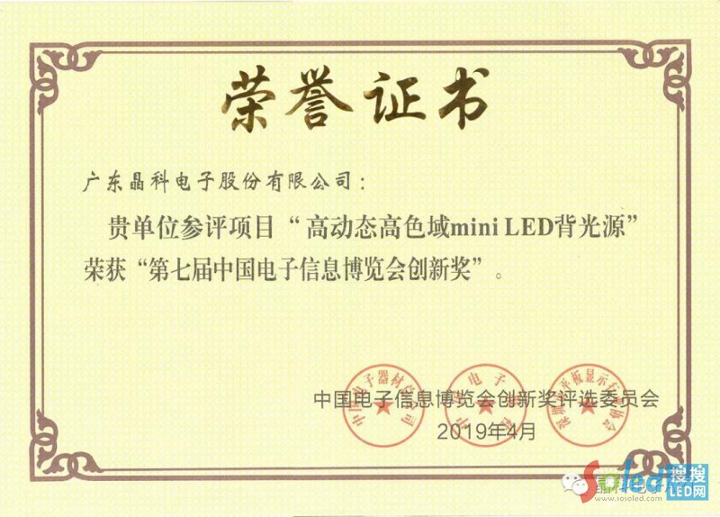 晶科電子憑借著“高動態(tài)高色域Mini LED背光源”技術(shù)產(chǎn)品,榮獲第七屆中國電子信息博覽會新型顯示類創(chuàng)新獎。