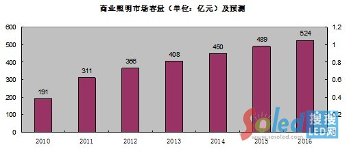 根據(jù)麥肯錫的調(diào)研,2011中國(guó)辦公照明市場(chǎng)份額約為184億,預(yù)計(jì)到2016年,辦公照明的市場(chǎng)將達(dá)到310億元,2010年至2016年的復(fù)合增長(zhǎng)率為19%。商店照明包含的范圍較廣,主要有百貨商場(chǎng)、超市、專賣店等。2007年至2011年,中國(guó)商業(yè)營(yíng)業(yè)房投資額的復(fù)合增長(zhǎng)率為28%。營(yíng)業(yè)房投資額的增加必將帶動(dòng)商店照明市場(chǎng)容量的增長(zhǎng)。根據(jù)麥肯錫的調(diào)研,2011中國(guó)商店照明的市場(chǎng)份額為84億元,2011年達(dá)到127億,預(yù)計(jì)到2016年,商店照明的市場(chǎng)容量將達(dá)到214億元,2010年至2016年的復(fù)合增長(zhǎng)率為17%。