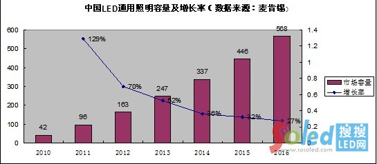 2010年我國(guó)LED通用照明市場(chǎng)為42億元,2011年達(dá)到96億元,增幅為126%,根據(jù)麥肯錫的預(yù)測(cè),2013年以后中國(guó)LED通用照明市場(chǎng)增速將保持平穩(wěn),預(yù)計(jì)到2016年,市場(chǎng)份額將達(dá)到568億元,2010到2016年的復(fù)合增長(zhǎng)率為54%。