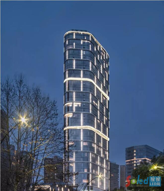 在避難層用洗墻燈照亮頂部,為建筑在夜景增加兩條靈動的燈光飄帶,創(chuàng)造建筑豐富的燈光層次感。