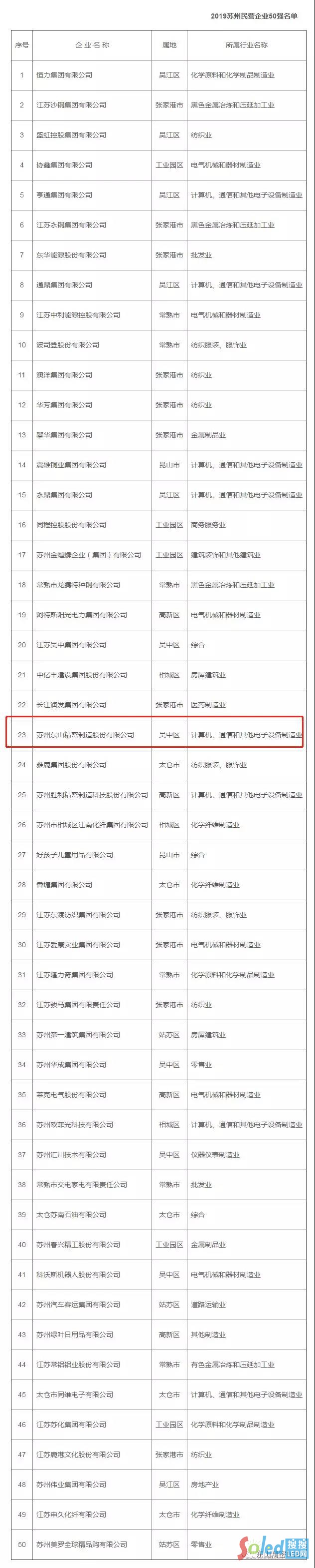 又訊:近日,由蘇州市工商業(yè)聯(lián)合會發(fā)布的“2019蘇州民營企業(yè)50強”榜單,蘇州東山精密制造股份有限公司榮獲“2019蘇州民營企業(yè)50強”第23位。