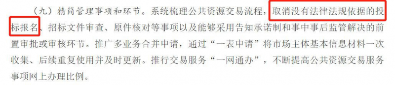 近期,國務(wù)院辦公廳發(fā)布了《國務(wù)院辦公廳轉(zhuǎn)發(fā)國家發(fā)展改革委關(guān)于深化公共資源交易平臺整合共享指導(dǎo)意見的通知》,通知明確提出:精簡管理事項和環(huán)節(jié)。系統(tǒng)梳理公共資源交易流程,取消沒有法律法規(guī)依據(jù)的投標報名。