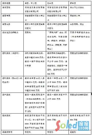 主板、中小板、創(chuàng)業(yè)板和新三板上市要求對比圖