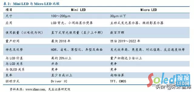 Mini LED 是指尺寸在 100 微米量級的 LED 芯片,尺寸介于小間距 LED 與 Micro LED 之間,Mini LED 是小間距 LED 尺寸繼續(xù)縮小的結果。Mini LED 技術成熟、量產(chǎn)可行,有 望在中高端液晶顯示屏背光、LED 顯示得到大規(guī)模應用,特別是電視、筆記本、顯示器等 領域。