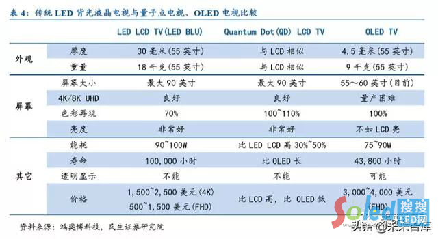 傳統(tǒng) LED 背光液晶電視相對 OLED TV 的缺點在于更厚(若采用側入式需要導光成本 增加很多)、更重、顯示效果不如 OLED,同時能耗更高。LCD TV 優(yōu)點在于技術成熟、 價格便宜。量子點 LCD TV 相比傳統(tǒng) LED 背光液晶電視提升了顯示效果的同時,功耗和成 本明顯上升。