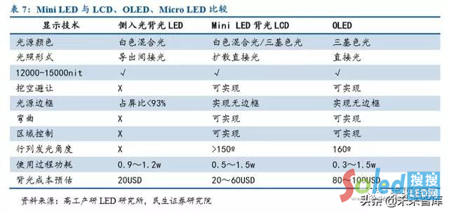 3)LCD 面板能夠做得更薄,因為 mini LED 尺寸小,顯示屏厚度更加接近 OLED,從 而可以在手機、筆記本電腦等便攜式消費電子中得到廣泛應用;