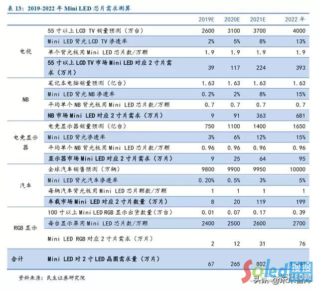 據(jù)我們測算,2020 年 Mini LED 顯示和背光產(chǎn)品將新增 2 寸 LED 晶圓 265 萬片,約占2018 年全球 LED 晶圓總產(chǎn)能約 1.8 億片的 1.47%。