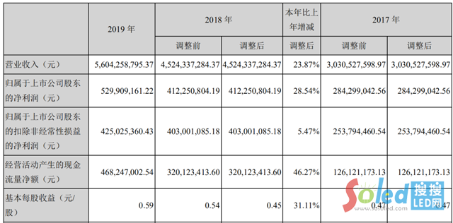 4月25日,洲明科技發(fā)布2019年年度報告,公司實現(xiàn)營業(yè)收入56.04億元,同比增長23.87%;歸母凈利潤達(dá)5.30億元,同比增長28.54%;其中經(jīng)營性活動現(xiàn)金流凈額4.68億元,同比增長46.27%,占凈利潤比例87.05%。