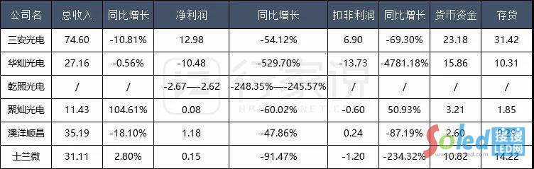 從凈利潤(rùn)上看,除老大哥三安光電依然保持10億級(jí)的凈利外,其余各家凈利甚微或是陷入了虧損;但老大哥的日子也不好過(guò),凈利潤(rùn)下降了54.12%。如果從扣非凈利潤(rùn)上,那數(shù)值就更少了,能實(shí)現(xiàn)扣非利潤(rùn)同比增長(zhǎng)的只有聚燦光電,但聚燦光電的扣非利潤(rùn)也還是虧損的。