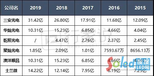 表:LED芯片上市公司2019年財(cái)務(wù)數(shù)據(jù)匯總,單位:億元
