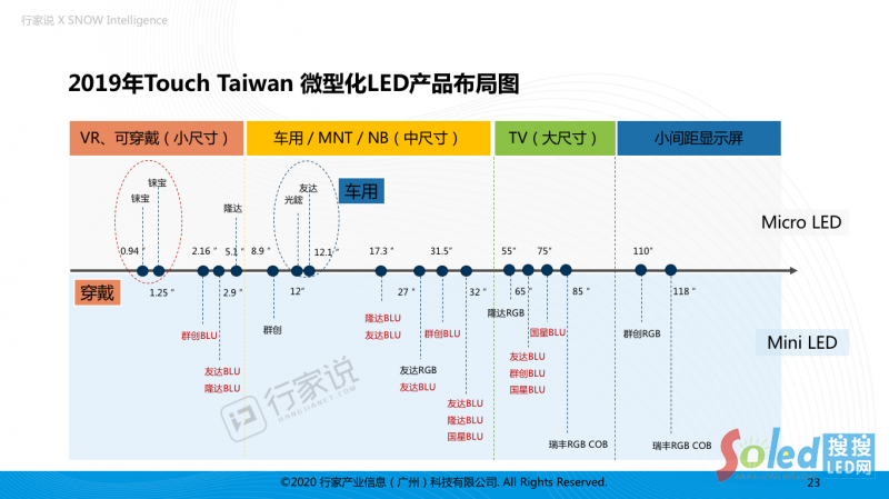 Touch Taiwan展中,我們發(fā)現(xiàn),從小尺寸可穿戴,到中尺寸車用、筆記本、顯示器,再到大尺寸TV領(lǐng)域,群創(chuàng)光電和友達(dá)光電均有布局,隆達(dá)則重點(diǎn)在中小尺寸;國(guó)星光電則重點(diǎn)展示了中大尺寸層面。