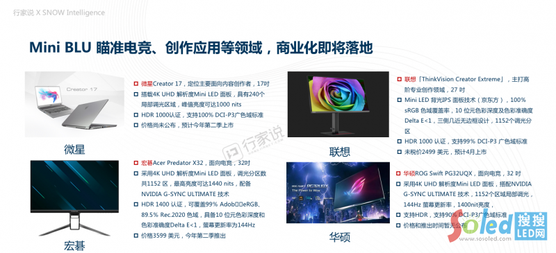 在品牌大廠帶動(dòng)下,筆電和顯示器尺寸多朝17 吋、27 吋和32 吋發(fā)展,4K解析度、高亮度、高刷新、高廣色域和電競(jìng)螢?zāi)淮钆淝^(qū)Mini LED 調(diào)光區(qū)域也成主流規(guī)格;驹诮衲2季度都能上市,量產(chǎn)商業(yè)化落地速度非?。