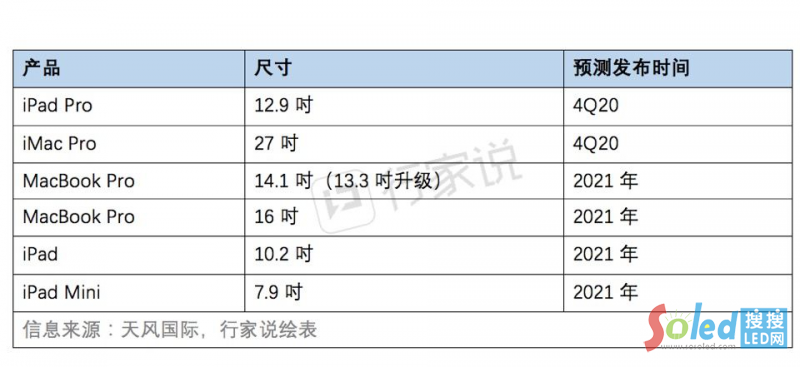 此外,有消息顯示,蘋果計(jì)劃于2020年底或2021年初推出Mini LED背光產(chǎn)品,預(yù)期包括10-12寸的iPad和15-17寸的Mac Book在內(nèi)的6款產(chǎn)品將在2021年底前面市。