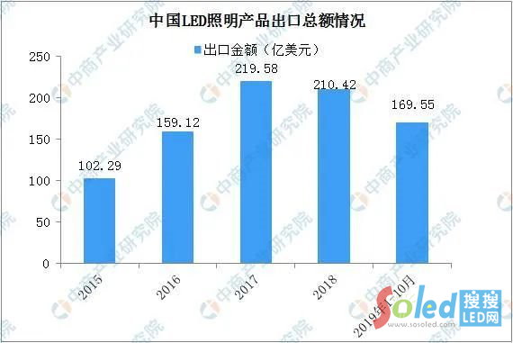 根據(jù)GGII的統(tǒng)計(jì),中國(guó)LED照明產(chǎn)品出口總額從2015年的102.29億美元增長(zhǎng)到2018年的210.42億美元,年均復(fù)合增長(zhǎng)率達(dá)到27.18%。受中美貿(mào)易摩擦的影響,中國(guó)LED照明產(chǎn)品出口市場(chǎng)有所下滑,但隨著中美貿(mào)易關(guān)系出現(xiàn)緩和,LED照明出口需求總體呈復(fù)蘇趨勢(shì)。