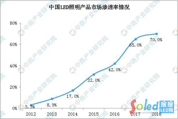 根據(jù)國(guó)家半導(dǎo)體照明工程研發(fā)及產(chǎn)業(yè)聯(lián)盟(CSA)的統(tǒng)計(jì),中國(guó)LED照明產(chǎn)品國(guó)內(nèi)市場(chǎng)滲透率(LED照明產(chǎn)品國(guó)內(nèi)銷(xiāo)售數(shù)量/照明產(chǎn)品國(guó)內(nèi)總銷(xiāo)售數(shù)量)由2012年的3.3%快速提升至2018年的70%,遠(yuǎn)超全球平均水平。
