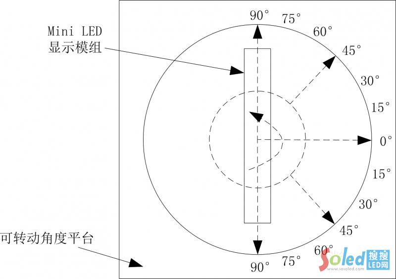(1) 將Mini LED顯示模組放置在轉(zhuǎn)臺(tái)上,在Mini LED顯示模組最高灰度級(jí)、最高亮度級(jí)下全白場(chǎng)顯示;