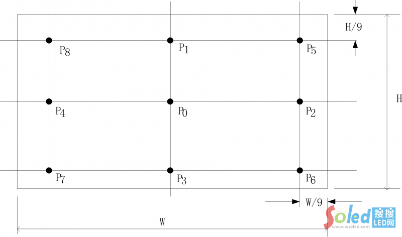 b) 用彩色分析儀測(cè)量圖3所規(guī)定的P0-P8各個(gè)點(diǎn)的亮度值L0-L8;