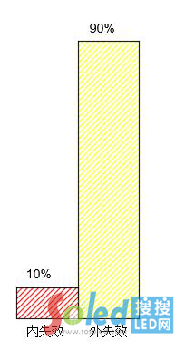 根據(jù)我們的研究發(fā)現(xiàn),LED的像素失效分為內(nèi)失效與外失效。內(nèi)失效主要是在像素膠體內(nèi)部由LED芯片缺陷或LED芯片的封裝工藝造成的。外失效的成因比較復(fù)雜,但主要被認為是封裝器件引腳由SMT的焊接工藝缺陷造成的。其次是在復(fù)雜的環(huán)境應(yīng)用條件下,由靜電、磕碰或潮濕鹽霧環(huán)境因素攻擊了器件引腳產(chǎn)生的氧化問題造成的。外失效數(shù)量占總失效數(shù)量的90%強,內(nèi)失效數(shù)量不足10%弱。
