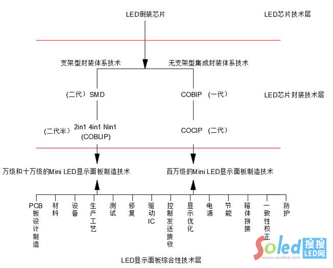 圖二還用以說明,LED芯片技術(shù)和LED芯片封裝技術(shù)是Mini LED顯示面板制造技術(shù)中最重要的兩個底層支撐技術(shù),缺一不可。LED芯片永遠離不開封裝技術(shù)對它的保護。這兩種底層支撐技術(shù)相比較而言,封裝技術(shù)顯得尤為重要。因為LED芯片技術(shù)只能體現(xiàn)行業(yè)技術(shù)水平的發(fā)展高度,但它不能決定行業(yè)的發(fā)展方向,行業(yè)的發(fā)展方向從來都是由封裝體系技術(shù)所主導(dǎo)的,原因是LED芯片具有被選擇性,同樣的芯片被不同的封裝體系技術(shù)所選中,生產(chǎn)出的Mini LED顯示面板差別巨大。