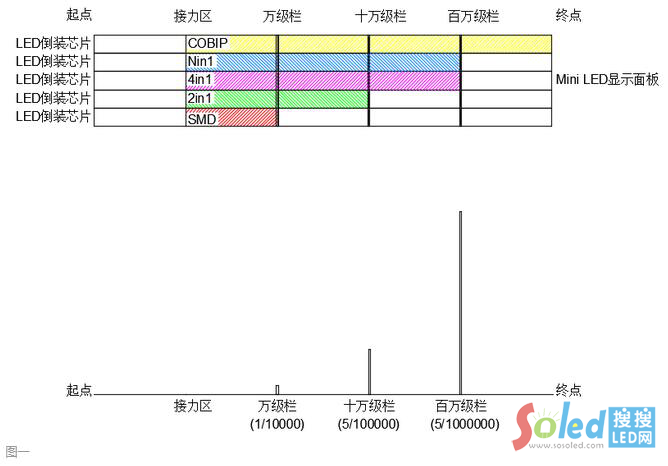 在有5個賽段和5個分區(qū)的接力+跨欄賽道上,起點處可以看到有五個LED倒裝芯片的參賽選手,它們分別對應(yīng)5個分區(qū)賽道上在接力區(qū)等待的SMD封裝技術(shù)、2in1封裝技術(shù)、4in1封裝技術(shù)、Nin1封裝技術(shù)和COBIP封裝技術(shù),LED倒裝芯片們跑完了第 一賽段后把接力棒分別交給了這5種封裝技術(shù),在第二賽段和第三賽段之間設(shè)置了解決面板級像素失效能力的第 一個萬級欄,像素失控率指標設(shè)定在1/10000,這時你會注意到SMD封裝技術(shù)已沒有能力越過,被淘汰了下來。剩下的4位封裝技術(shù)選手繼續(xù)在第三段賽道上向前。這里需要說明的是,在第二賽段上如果2in1、4in1和Nin1封裝技術(shù)(IMD)沒有做引腳數(shù)量減少的優(yōu)化解決方案,而且使用的是全正裝芯片做的封裝器件,和SMD封裝技術(shù)的結(jié)果一樣,也是不能跨越過第 一個萬級欄的。但如果用了倒裝芯片而沒有做器件引腳數(shù)量減少的優(yōu)化,萬級欄可能剛剛有能力越過,但很危險,處于臨界的邊緣,取決于各企業(yè)的封裝技術(shù)能力。我們的研究認為,對COBLIP技術(shù)分類來說,面板級像素失效控制能力的提升與封裝器件引腳數(shù)量的減少有高度相關(guān)性,引腳數(shù)量減少一半,能力可以提升一倍(達到1/20000=5/100000)。所以在第三賽段和第四賽段之間設(shè)置了十萬級欄,像素失控率指標設(shè)定在5/100000,是基于目前看到的2in1、4in1和Nin1封裝技術(shù)(IMD)與SMD封裝技術(shù)相比封裝器件焊接引腳數(shù)量基本上都是減少了一半。如果是這樣,前面的十萬級欄風(fēng)險很大。器件集成度越低,風(fēng)險越大。在這類技術(shù)中我們知道2in1的器件集成度最低。但如果器件引腳減少的數(shù)量大于50%,就可以躍過這個十萬級欄。這個5/100000的十萬級欄基本上就是支架型封裝燈驅(qū)分離體系技術(shù)與無支架型集成封裝燈驅(qū)合一體系技術(shù)的分水嶺。在第四賽段與第五賽段之間我們設(shè)置了比萬級欄高兩個數(shù)量級的百萬級欄,像素失控率指標設(shè)定在5/1000000(這道跨欄是檢驗所有Mini LED技術(shù)中有關(guān)封裝概念技術(shù)的試金石。我們認為目前只有COBIP封裝技術(shù)可以跨越過去,這是基于我們有近10年的實際案例數(shù)據(jù)支撐。用全正裝芯片技術(shù)做COBIP全彩顯示面板,客戶端使用一年后,像素失控率基本上維持在5ppm左右。我們的封裝設(shè)備還不算先進,如果行業(yè)同行用更好的設(shè)備,使用全倒裝芯片+COBIP封裝技術(shù),滿足我們新的技術(shù)規(guī)范中的百萬級像素失控率指標要求應(yīng)該是很輕松的事。