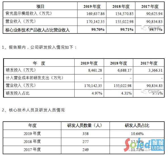 公司核心業(yè)務(wù)為背光顯示模組的研發(fā)、生產(chǎn)和銷售。核心業(yè)務(wù)技術(shù)產(chǎn)品收入占營(yíng)業(yè)收入的比例如下所示:
