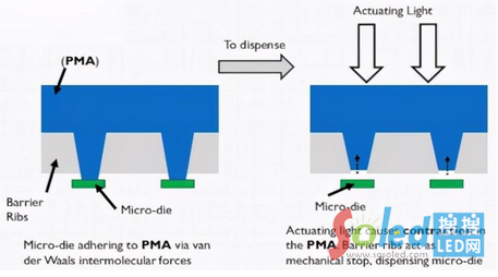VerLASE的Micro LED技術(shù)是基于其獨(dú)有的光機(jī)械驅(qū)動(dòng)(PMA)技術(shù)開發(fā)的,也就是通過印章轉(zhuǎn)移結(jié)構(gòu)和能夠準(zhǔn)確抓取大量Micro LED的新型化學(xué)機(jī)制,將Micro LED芯片轉(zhuǎn)移到所要求的襯底上,再以高精度和高速度進(jìn)行分配和放置。