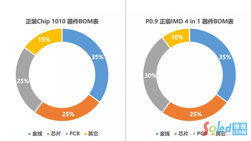 前段工序,芯片投料直接從1010器件采購(gòu)的芯片中分選寬色域的波長(zhǎng)、亮度段用于IMD 0.9器件,在一定產(chǎn)能的基礎(chǔ)上,可與1010芯片采購(gòu)成本相持平;