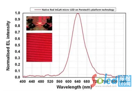 Porotech表示其產(chǎn)品符合現(xiàn)有的行業(yè)標(biāo)準(zhǔn)和流程,其專有技術(shù)既強大又靈活,足以適應(yīng)不同應(yīng)用的需求。Porotech的原生InGaN Micro LED在10A/cm2處具有640nm的波長,在非常小的像素和間距下,與常規(guī)的AlInGaP和顏色轉(zhuǎn)換所得的紅光相比,性能得到了改善。