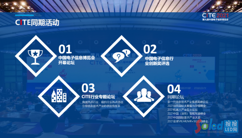 博覽會(huì)同期,以“CITE2021”展示成果為依托,組委會(huì)為進(jìn)一步擴(kuò)大同期活動(dòng)影響力、充實(shí)活動(dòng)內(nèi)容、強(qiáng)化活動(dòng)特色,在展會(huì)同期還將舉辦“1+N”場論壇活動(dòng),囊括中國電子信息博覽會(huì)開幕論壇、新一代信息技術(shù)產(chǎn)業(yè)集群高峰論壇、2021深圳國際大數(shù)據(jù)與存儲(chǔ)峰會(huì)、2021機(jī)器人產(chǎn)業(yè)院士論壇、2021中國(深圳)智能駕駛峰會(huì)、2021中國國際顯示產(chǎn)業(yè)大會(huì)、2021全球VR/AR/MR+5G應(yīng)用峰會(huì)。論壇將邀請(qǐng)政府行業(yè)主管部門領(lǐng)導(dǎo)、國內(nèi)外著名專家學(xué)者、國內(nèi)外企業(yè)家發(fā)表主題演講,促進(jìn)產(chǎn)業(yè)交流,碰撞創(chuàng)新火花。同時(shí),中國電子信息行業(yè)創(chuàng)新評(píng)選組委會(huì)將聯(lián)合電子信息領(lǐng)域十大行業(yè)協(xié)會(huì),共同組織評(píng)選“中國電子信息行業(yè)創(chuàng)新金獎(jiǎng)”及“中國電子信息行業(yè)創(chuàng)新獎(jiǎng)”并在現(xiàn)場舉行隆重的頒獎(jiǎng)儀式,評(píng)選活動(dòng)將邀請(qǐng)行業(yè)資深專業(yè)人士、國內(nèi)外著名專家學(xué)者、理事會(huì)相關(guān)專家企業(yè)家代表進(jìn)行打分評(píng)選,旨在推進(jìn)創(chuàng)新產(chǎn)品落地,促進(jìn)國內(nèi)國際雙循環(huán)。