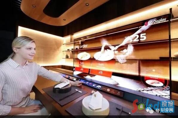 ‘餐廳展區(qū)’的展示理念是展示受新冠肺炎影響不見面時代的場景。展示在餐廳里在客人與廚師之間用透明OLED做分區(qū),在看菜單的同時,等待出菜時間觀看體育賽事。