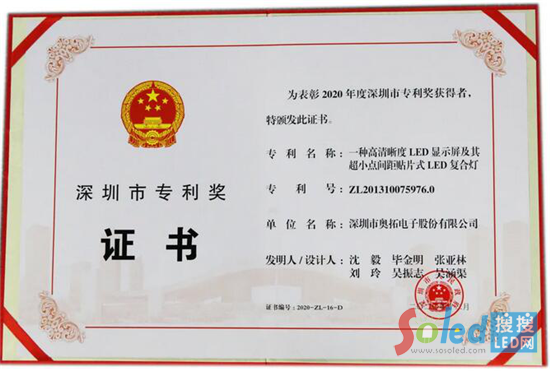 核心提示:在1月6日舉行的“深圳市科學(xué)技術(shù)獎(jiǎng)勵(lì)大會”上,奧拓電子“一種高清晰度LED顯示屏及其超小點(diǎn)間距貼片式LED復(fù)合燈”專利獲得深圳市專利獎(jiǎng),這是奧拓電子第3次獲得深圳市專利獎(jiǎng)。